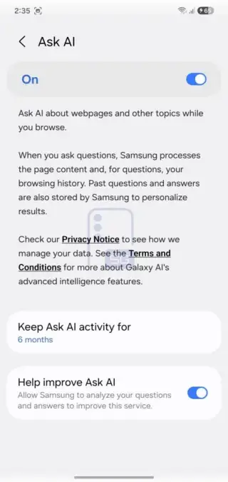 - Ask AI: With Ask AI in Samsung Internet, you can ask questions about a webpage that is open in your browser. It can analyze your browsing history and the contents of the page to provide answers. It can store data up to 6 months or only for the current session.