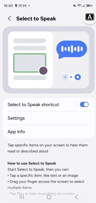 - Select to Speak: It lets you tap on any text, and it reads it out loud. Similarly, the Text Spotlight increases the size of the text so you can read it clearly.